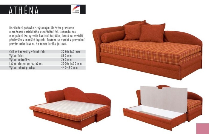 Rozkládací pohovka ATHÉNA s výsuvným úložným prostorem a volitelným uspořádání čel. Jednoduchou manipulací lze vytvořit kvalitní dvojlůžko, které se osvědčí především v menších bytech. Sestava se vyrábí v provedení pravém nebo levém. Na tomto letáku je pravá. Pro použití na časté spaní doporučujeme variantu 2 zásuvky. Ložná plocha je zde 200x160cm !!!