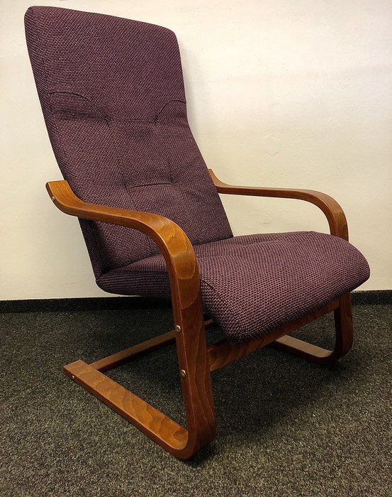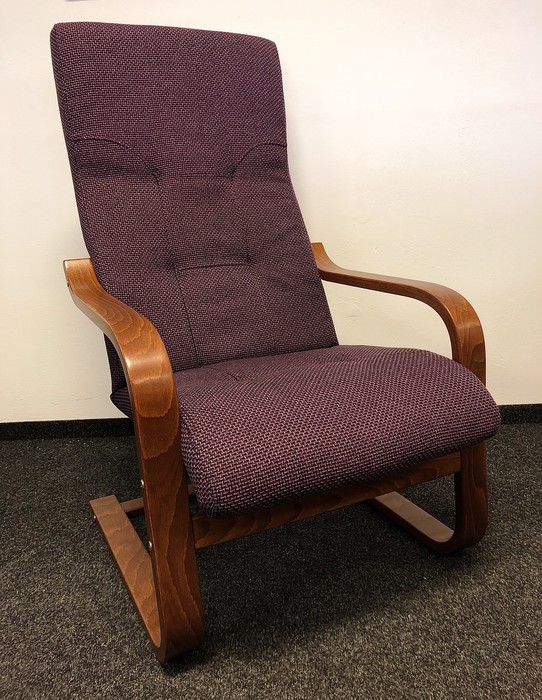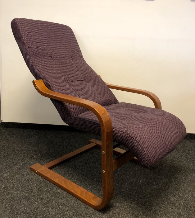 Odlehčené elegantní křeslo, které skvěle doplní jakýkoliv interiér, jakoukoliv sedací soupravu. Očalouněná kovová kostra je zavěšena v lamelovém masivním rámu, umožňujícím v křesle příjemné pohupování. Křeslo lze objednat také v polohovací verzi. Barvu a typ potahové látky lze vybrat z cca 30 druhů látek z nichž každá je vyráběna v mnoha barevných odstínech.