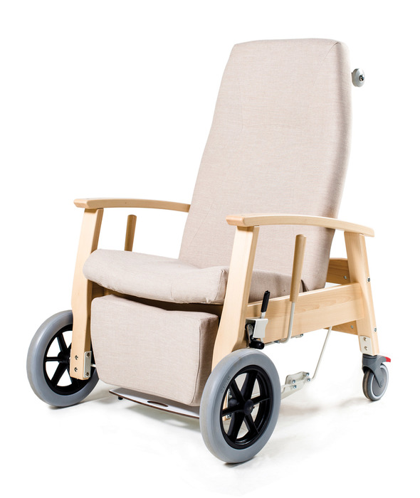 - Pevná dřevěná konstrukce křesla z masivního buku na 2 pevných kolech ∅300 mm a 2 otočných kolech ∅125 mm s brzdou.