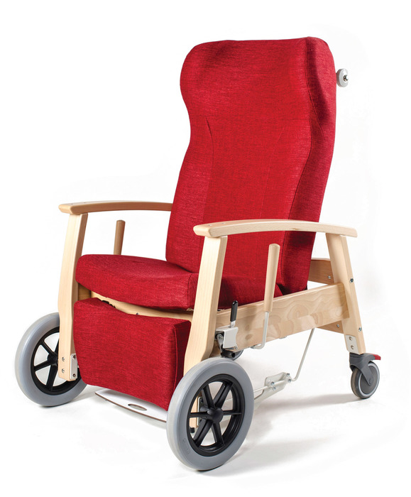 - Pevná dřevěná konstrukce křesla z masivního buku na 2 pevných kolech ∅300 mm a 2 otočných kolech ∅125 mm s brzdou.