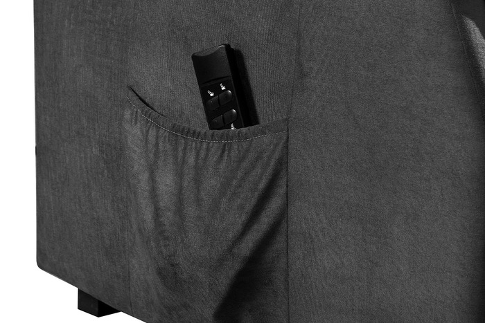 Dva integrované motory a čtyřtlačítkové kabelové ovládání pomáhají nejen při vstávání, ale i nastavení všech relaxačních poloh jednotlivě. Ovladač je umístěn v praktické a velké kapse na pravé straně křesla. Tu můžete využít i jiným způsobem, například jí naplnit bonbóny a postupně je odebírat při chvilkách zasloužené relaxace a odpočinku.