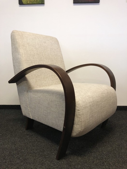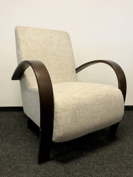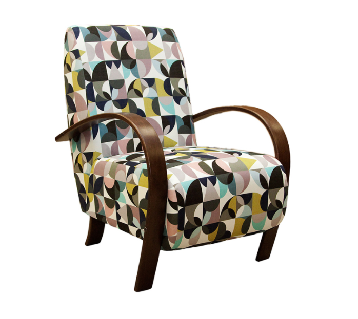 Komfortní křeslo v retro stylu. Masivní područky v odstínu: přírodní, ořech, olše. Barvu a typ potahové látky lze vybrat z cca 30 druhů látek z nichž každá je vyráběna v mnoha barevných odstínech.