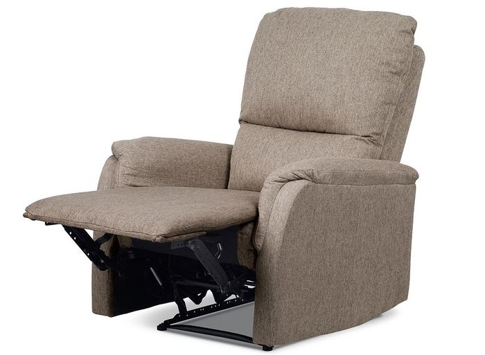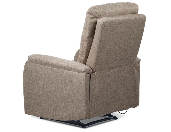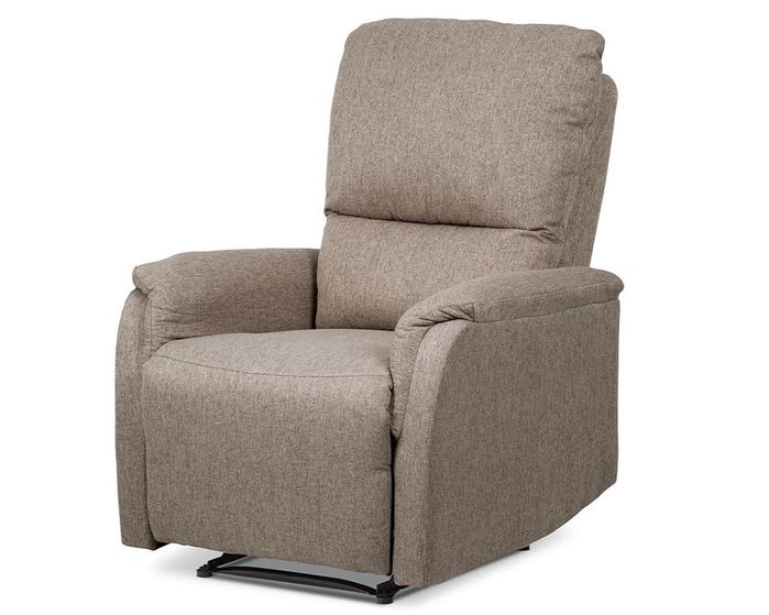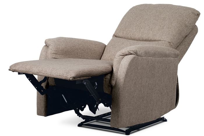 Klasické relaxační TV křeslo v látkovém potahu v trendy cappuccino barevném odstínu a prošitím ve stejném provedení. Kostra je z masivního dřeva, mechanická konstrukce je kovová s kvalitním práškovým nástřikem v černé barvě. Výplň je z PU pěny. Ovládání – odemknutí relaxačních poloh je z pravé strany a děje se černou plastovou páčkou. Zatažením za ní se aktivuje relaxační poloha I – výklop podnože a dalším zatažením přecházíte sklopením opěráku do relaxační polohy II. Zamknutí se děje automaticky. Šíře područek je 16 cm, výška je 60 cm. Světlá výška křesla je 5 cm. Nosnost je 120 kg. Nohy jsou součástí mechanické konstrukce a dotyková část s podlahou je opatřena plastovými kluzáky. Tím je minimalizována možnost poškození podlahové krytiny.